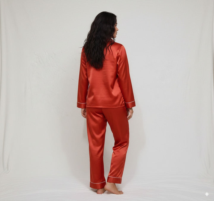 Experience the perfect blend of comfort and elegance with our Women’s Satin Pyjama Set. Crafted from premium satin fabric, this night suit is designed to give you a silky-smooth touch and a glamorous look. The set includes a stylish button-down top with contrast piping details and matching pyjamas, making it ideal for both sleepwear and loungewear.